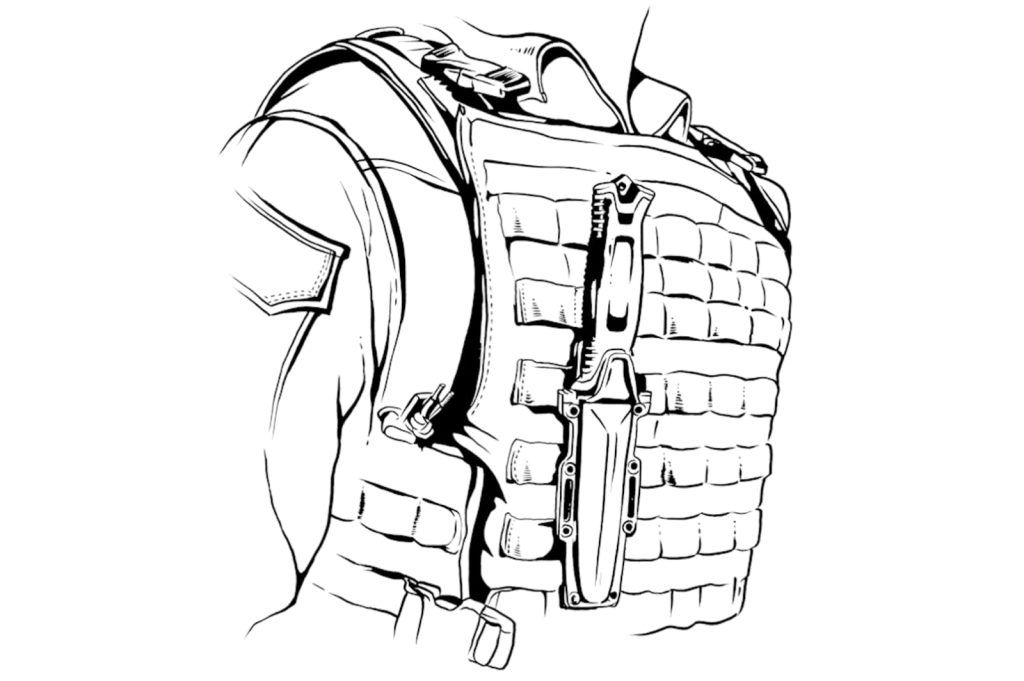 La funda está equipada con una correa MOLLE de fácil colocación que permite llevar el cuchillo en posición vertical.
