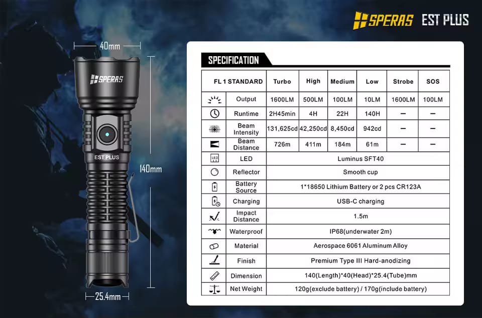 La EST PLUS se ha actualizado con el nuevo LED Luminus SFT40 importado, que produce una potencia máxima de 1600 lúmenes y un alcance de 726 metros. Basándose en las características clásicas de la EST, su aspecto robusto y clásico incluye una interfaz muy intuitiva con un botón trasero y un botón lateral. Es compatible con USB-C para una carga rápida, alcanzando una carga completa en 4,3 horas. Alimentada por una sola batería 18650 de 3800 mAh, ofrece una larga duración de hasta 140 horas. Con un rendimiento inigualable y una construcción duradera, esta linterna es la opción preferida para caza, búsqueda y rescate, tareas policiales, actividades al aire libre como acampada, etc.